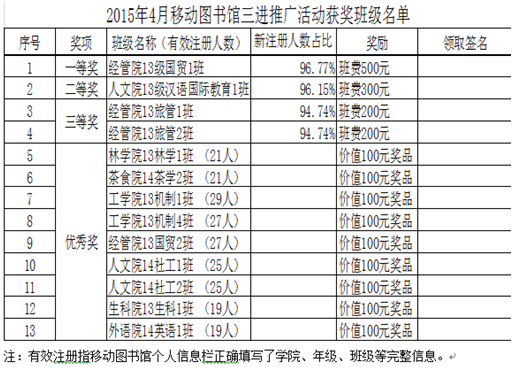 5、2015年6月5日,“移动阅读,改变生活,改变未来”:“超星杯”移动图书馆“三进”——进办公室、进教室、进宿舍推广活动获奖班级名单揭晓。