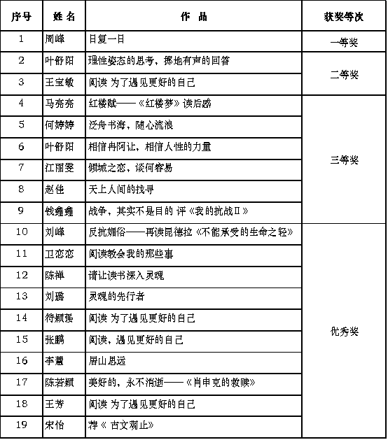 3、2015年 4月29日,由安徽省高等学校图书情报工作委员会主办、安徽省内各高校图书馆、北京中文在线教育科技发展有限公司承办的全省首届“品读经典 对话信仰”互联网读书征文活动已经圆满结束,我校理学院张宪林老师的征文《青春-阳光-爱(完整版)》获得一等奖,经济管理学院14工商管理专业的刘书仙同学获得三等奖。