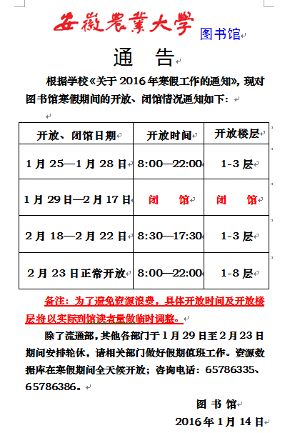 图书馆寒假期间的开放、闭馆情况通知