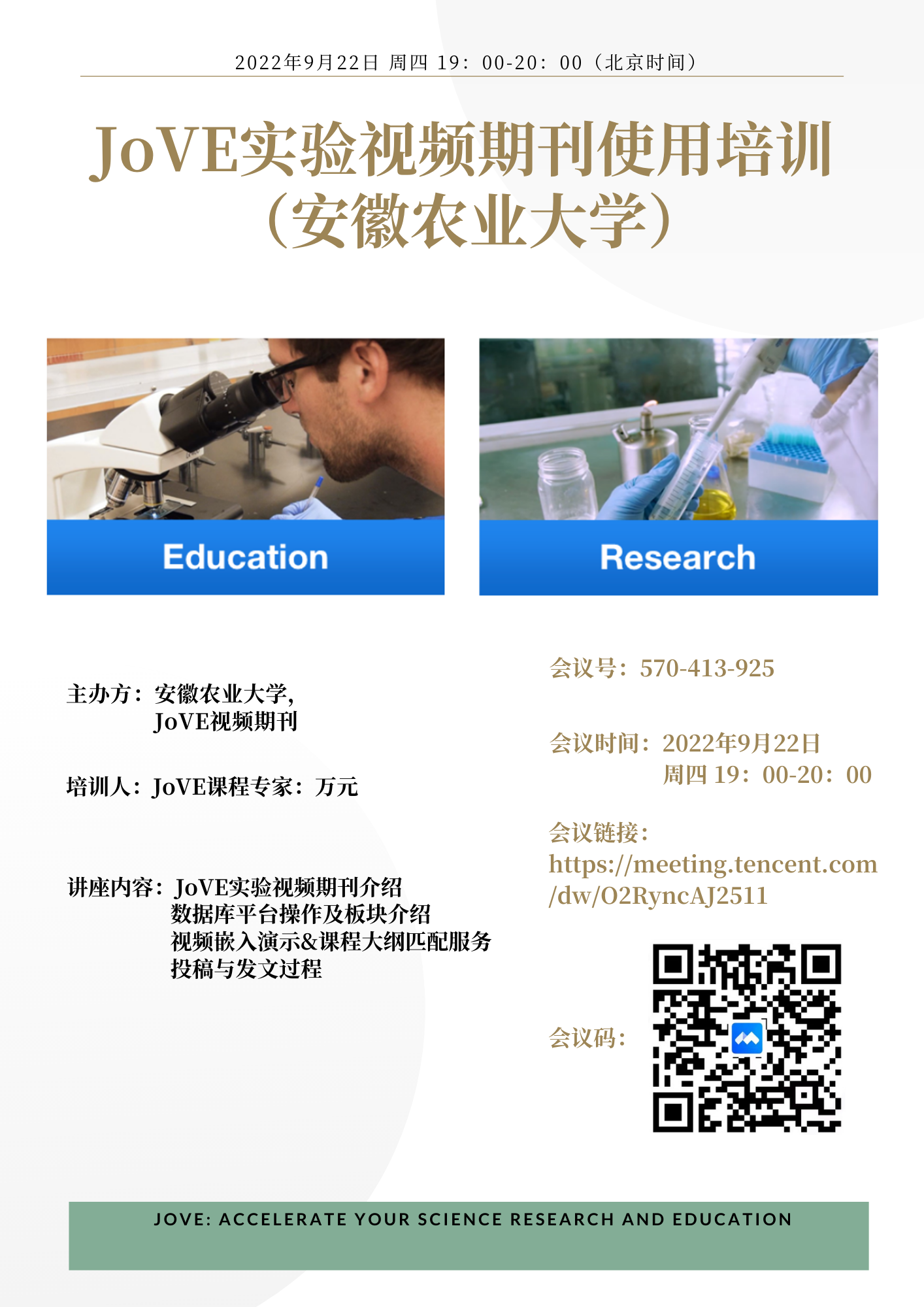 安徽农业大学图书馆2022下半年第4周“一小时培训”讲座通知 ——JOVE实验视频期刊使用培训